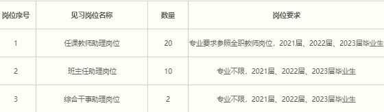 5、見習老師應(yīng)聘者,要求是全國普通高等學校未購買過社保的2021屆、2022屆、2023屆畢業(yè)學生,來校見習實習時間不能少于3個月(見習實習時間少于3個月者,無見習實習津貼)。
