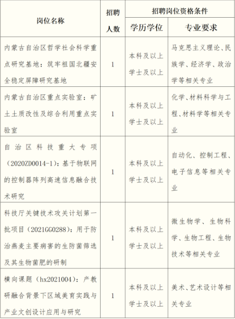 為深入貫徹習(xí)近平總書記關(guān)于高校畢業(yè)生就業(yè)工作的重要指示批示精神,落實(shí)科技部、教育部、人力資源社會保障部、財(cái)政部等6部門《關(guān)于鼓勵科研項(xiàng)目開發(fā)科研助理崗位吸納高校畢業(yè)生就業(yè)的通知》(國科發(fā)資〔2020〕132號)和科技部“部署開發(fā)科研助理崗位工作地方科技管理部門和國家高新區(qū)視頻會議”任務(wù)要求,做好吸納高校畢業(yè)生就業(yè)工作,根據(jù)內(nèi)蒙古自治區(qū)科學(xué)技術(shù)廳《關(guān)于做好科研助理崗位開發(fā)和落實(shí)工作的通知》(內(nèi)科成字﹝2022﹞44號)文件精神和工作安排,現(xiàn)面向社會公開招聘科研助理5名(非事業(yè)編制)。