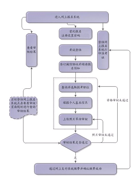 基本流程為:登錄報名網(wǎng)站—>閱讀并同意考生誠信承諾—>進入報名界面按報名系統(tǒng)提示填寫報名信息—>上傳近期清晰免冠電子照片—>等待報名資格審核—>審核通過后網(wǎng)上繳費