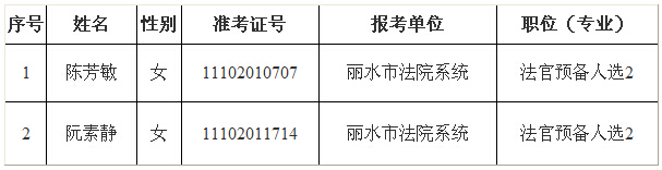 根據(jù)《2015年麗水市各級(jí)機(jī)關(guān)考試錄用公務(wù)員公告》和《浙江省公務(wù)員錄用考察工作細(xì)則(試行)》(浙人發(fā)〔2008〕58號(hào))等精神,經(jīng)筆試、面試、體檢等程序確定考察對(duì)象。現(xiàn)擬對(duì)下列2位同志進(jìn)行考察,希望廣大干部群眾對(duì)我們的考察工作和考察對(duì)象進(jìn)行監(jiān)督,有什么意見(jiàn)和建議,請(qǐng)及時(shí)與組織、人力社保部門(mén)或考察小組聯(lián)系。