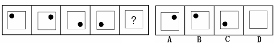 (答案:B。黑點(diǎn)在正方形中順時針移動。在第5個圖形中,應(yīng)該正好移動到左上角。)
