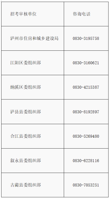 7.請考生認真對照職位要求選擇完全符合的職位進行報名。對涉及到《瀘州市2022年上半年公開考試錄用公務(wù)員及參照管理工作人員職位情況表》中專業(yè)等招考條件方面的問題,按下列招考單位電話進行咨詢。