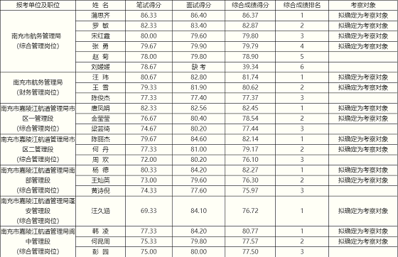 南充市航務(wù)管理局及所屬單位2022年公開遴選(考調(diào))工作人員面試工作已結(jié)束,根據(jù)《南充市航務(wù)管理局及所屬單位2022年公開遴選(考調(diào))工作人員公告》有關(guān)規(guī)定(考生未在規(guī)定時間內(nèi)領(lǐng)取面試通知書的,視為自動放棄,由此出現(xiàn)的缺額按照筆試成績從高到低依次遞補;未在規(guī)定時間內(nèi)到達指定地點參加面試的,視為自動放棄,由此出現(xiàn)的缺額不予遞補)。根據(jù)考試總成績和遴選(考調(diào))名額,按2:1差額確定考察對象(名額在2人以上的職位,名額之比不低于1.5:1),考察有關(guān)事宜另行通知,F(xiàn)將考生考試成績及考察對象公告如下。