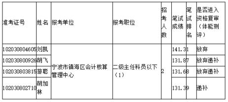 根據(jù)本次招考有關(guān)公告規(guī)定,面試對(duì)象在實(shí)施資格復(fù)審48小時(shí)前,確認(rèn)不參加資格復(fù)審的,在該職位筆試合格人員中按筆試成績(jī)從高分到低分予以遞補(bǔ),F(xiàn)將放棄資格復(fù)審(體能測(cè)評(píng))及遞補(bǔ)人員名單予以公告: