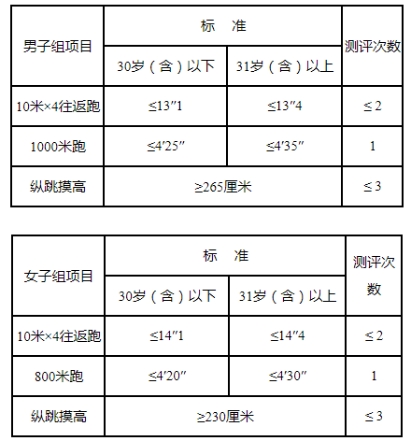 2、結(jié)果判定?忌枰淮涡酝ㄟ^三項測評方為體能測評合格,其中:10米×4往返跑測評不超過2次、縱跳摸高測評不超過3次、長跑測評1次;凡其中一項在規(guī)定測評次數(shù)內(nèi)未達標的,不再進行后續(xù)項目測評,體能測評結(jié)果為不合格。