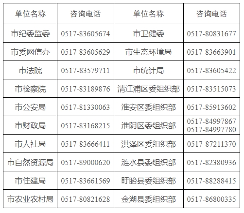 各招錄機關(guān)的招考人數(shù)、具體職位、考試類別、資格條件等信息可通過以下網(wǎng)站查詢:淮安黨建網(wǎng)(zzb.huaian.gov.cn)“招錄招聘”專欄、淮安市人力資源和社會保障局門戶網(wǎng)站“人事考試”專欄(http://rsj.huaian.gov.cn/col/4729_463783/index.html)。