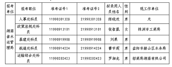 根據(jù)省委組織部、省人力資源和社會保障廳、省公務(wù)員局《湖南省2014年考試錄用公務(wù)員公告2014年7月11日》的有關(guān)規(guī)定,經(jīng)報名、筆試、資格審查、面試、體檢、考察等程序,確定2014年湖南省水運管理局考試錄用參照公務(wù)員法管理工作人員擬錄用人員名單: