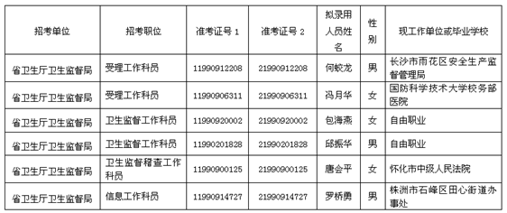 根據(jù)省委組織部、省人力資源和社會(huì)保障廳、省公務(wù)員局《湖南省2014年考試錄用公務(wù)員公告》的有關(guān)規(guī)定,經(jīng)報(bào)名、筆試、資格審查、面試、體檢、考察等程序,確定2014年湖南省衛(wèi)生廳衛(wèi)生監(jiān)督局考試錄用公務(wù)員擬錄用人員名單: