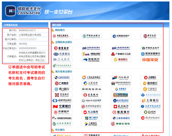 請(qǐng)?jiān)诖隧?yè)面的左邊部分中確認(rèn)自己需要支付的費(fèi)用和信息是否正確。在右邊部分中選擇具體銀行進(jìn)入銀行支付系統(tǒng)。