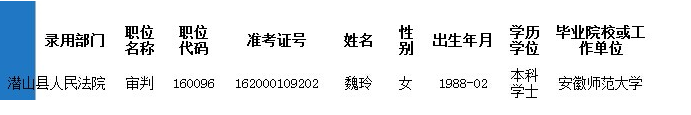 根據(jù)《安徽省2014年考試錄用公務員工作實施方案》(皖人社發(fā)〔2014〕8號)等規(guī)定,報考潛山縣法院的魏玲考生,經(jīng)報名、筆試、面試、體檢、考察等程序,符合本次考試錄用條件,擬錄用為公員。現(xiàn)將擬錄用人員名單(見附件)公示7天,公示時間從2014年12月16日至12月22日。如有問題,請及時向市委組織部、市人力資源和社會保障局、市公務員局、市監(jiān)察局反映。監(jiān)督聯(lián)系電話:市委組織部公務員管理辦公室0556-5346155、市公務員局0556-5897212、市監(jiān)察局執(zhí)法監(jiān)察一室0556-5702020.