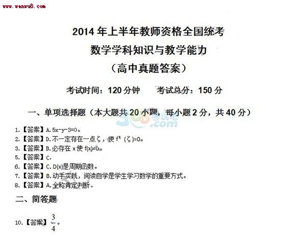 2014上半年教師資格考試《高中數(shù)學學科知識與教學能力》真題答案