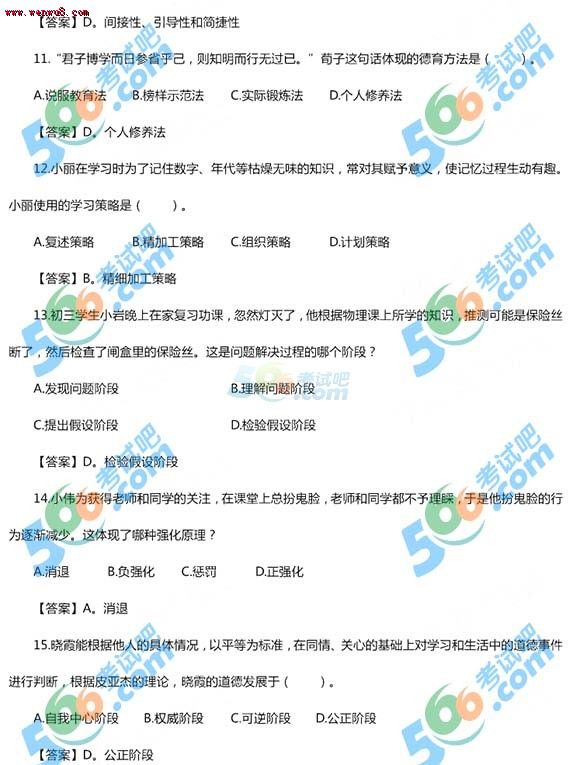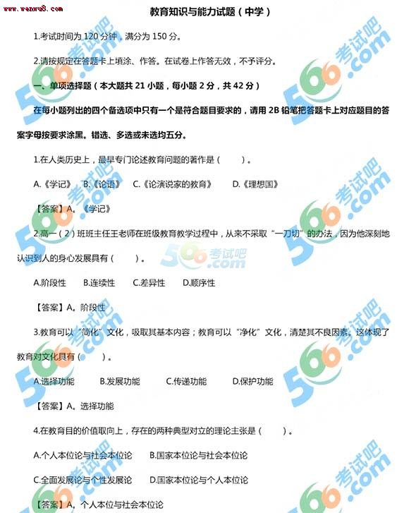 2014下半年教師資格證統(tǒng)考《中學(xué)教育知識(shí)與能力》真題及答案