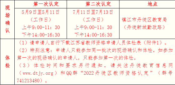 1.如根據(jù)當(dāng)?shù)匾咔榍闆r對現(xiàn)場確認(rèn)時間作出調(diào)整,會在丹徒教育信息網(wǎng)和QQ群“2022丹徒區(qū)教師資格認(rèn)定”中發(fā)布通知。
