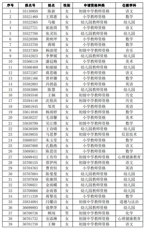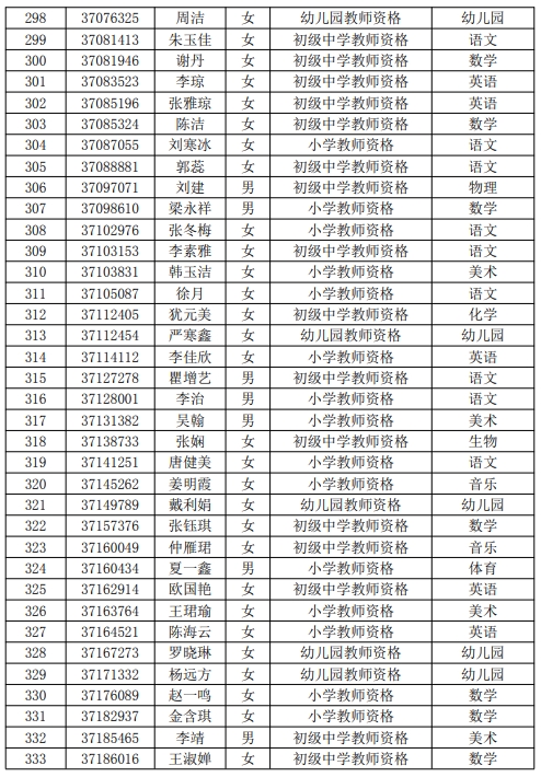 根據(jù)省、市教師資格認(rèn)定工作的要求,按照網(wǎng)上申請(qǐng)、體格檢查、現(xiàn)場確認(rèn)、違法犯罪記錄核查等程序,經(jīng)審定,333人通過資格認(rèn)定。現(xiàn)將認(rèn)定結(jié)果予以公示(見附件1),公示時(shí)間為2023年7月19日至2023年7月25日。如有異議,可在公示期內(nèi)向蘇州高新區(qū)(虎丘區(qū))教育局反映,聯(lián)系電話:0512-68751657。