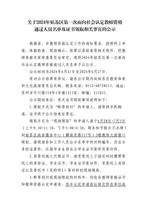 2024年關(guān)于蘇州姑蘇區(qū)第一次面向社會(huì)認(rèn)定教師資格通過人員名單及證書領(lǐng)取相關(guān)事宜的公示