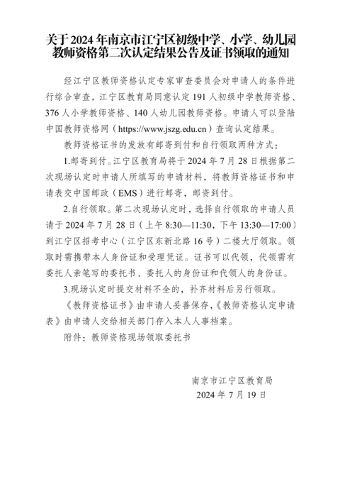 2024年關(guān)于南京市江寧區(qū)初級(jí)中學(xué)、小學(xué)、幼兒園教師資格第二次認(rèn)定結(jié)果公告及證書領(lǐng)取的通知