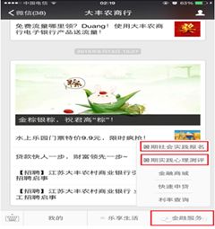 (4)微信報名:關注微信“大豐農商行”,點擊“金融服務”“暑期社會實踐報名表”填寫社會實踐活動報名表!笆钇趯嵺`心理測評”完成心理測評。