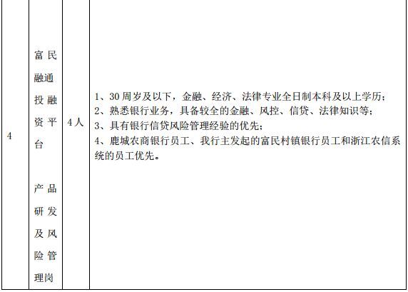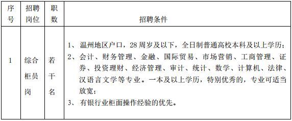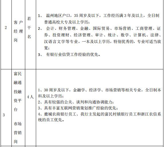 浙江溫州鹿城農(nóng)村商業(yè)銀行股份有限公司是一家經(jīng)中國銀監(jiān)會批準(zhǔn),在原鹿城農(nóng)村合作銀行的基礎(chǔ)上改制而成的股份制商業(yè)銀行。目前,全行擁有營業(yè)網(wǎng)點(diǎn)52家,在崗員工800多人,全行堅(jiān)持“做小、做廣、做精”的經(jīng)營理念,加快經(jīng)營轉(zhuǎn)型,進(jìn)一步傳承發(fā)揚(yáng)“普惠金融進(jìn)萬家”的農(nóng)信文化,并于今年推出溫州首家銀行系互聯(lián)網(wǎng)投融資平臺---“富民融通投融資平臺”,為客戶打造出一個新穎、便捷、安全的網(wǎng)絡(luò)理財(cái)投資平臺,實(shí)現(xiàn)財(cái)富增值。因業(yè)務(wù)發(fā)展需要,現(xiàn)面向社會公開招聘優(yōu)秀人才若干名。