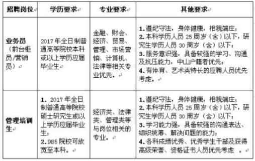 中山農(nóng)村商業(yè)銀行股份有限公司(簡稱:中山農(nóng)商銀行)前身中山市農(nóng)村信用合作聯(lián)社,成立于1952年,并于2013年6月28日成功轉(zhuǎn)制。截至2016年9月末,中山農(nóng)商銀行擁有212個營業(yè)網(wǎng)點,在職員工2600余名,是中山市營業(yè)網(wǎng)點與從業(yè)人員數(shù)量最多、服務(wù)面最廣、歷史最悠久的地方金融機(jī)構(gòu);人民幣各項存、貸款余額分別為697.94億元、441.89億元,均位居全市金融同業(yè)前三位。因業(yè)務(wù)發(fā)展需要,現(xiàn)向各大高校誠聘業(yè)務(wù)員及管理培訓(xùn)生,具體要求如下:
