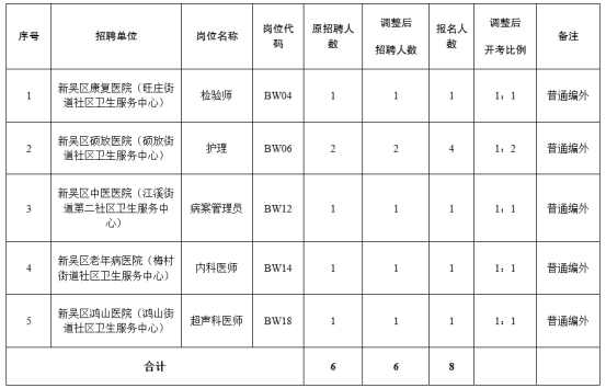 根據(jù)《2025年無錫高新區(qū)(新吳區(qū))醫(yī)療衛(wèi)生事業(yè)單位公開招聘工作人員公告(普通類編外)》相關(guān)規(guī)定,經(jīng)無錫高新區(qū)(新吳區(qū))人力資源和社會保障局備案,對以下崗位進行調(diào)整。