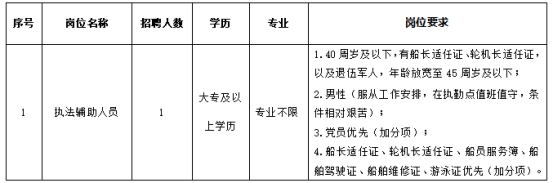 因工作需要,按照“自愿報名、公平競爭、擇優(yōu)錄用”的原則,無錫市濱湖區(qū)漁政監(jiān)督大隊公開招聘執(zhí)法輔助人員1名,現(xiàn)將有關(guān)招聘事項公告如下: