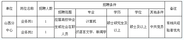 山西分中心的招聘崗位、人數(shù)、條件等詳見《崗位需求表》。 報考人員可以通過以下網(wǎng)站查閱《崗位需求表》:
