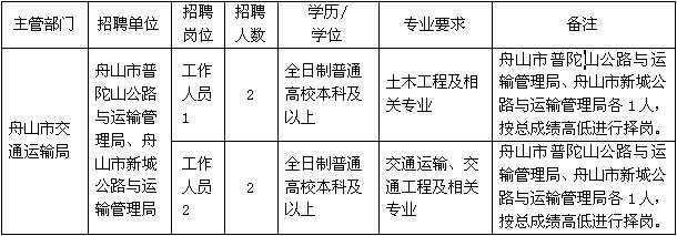 根據(jù)《浙江省事業(yè)單位公開招聘人員暫行辦法》要求,經(jīng)舟山市人力資源和社會(huì)保障局同意,市交通運(yùn)輸局部分直屬事業(yè)單位決定面向社會(huì)公開招聘4名工作人員。現(xiàn)將有關(guān)事項(xiàng)公告如下: