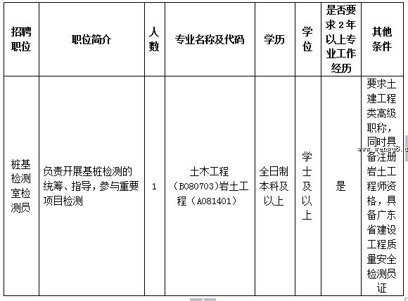 (2)應聘人員要求同時具備以下條件:具備土建工程類高級職稱,同時具備注冊巖土工程師資格和廣東省建設工程質(zhì)量安全檢測員證(上崗證)。