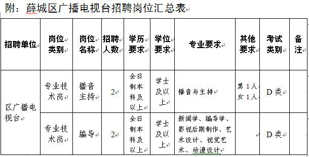 根據(jù)薛城區(qū)廣播電視事業(yè)發(fā)展需要,經(jīng)區(qū)委、區(qū)政府同意,決定面向社會(huì)公開招聘工作人員4名,現(xiàn)將有關(guān)事項(xiàng)公告如下: