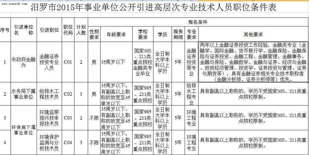 附:汨羅市2015年事業(yè)單位公開引進高層次專業(yè)技術人員職位條件表