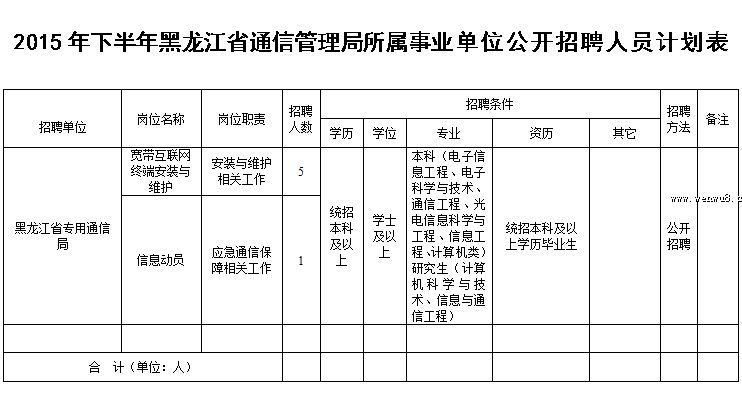 詳見附件:2015年下半年黑龍江省通信管理局所屬事業(yè)單位公開招聘人員計(jì)劃表