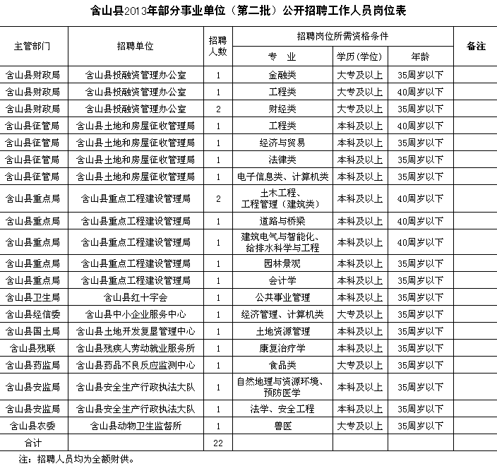 含山縣2013年部分事業(yè)單位(第二批)公開招聘工作人員22名,詳見《含山縣2013年部分事業(yè)單位(第二批)公開招聘人員崗位表》,以下簡稱《崗位表》。