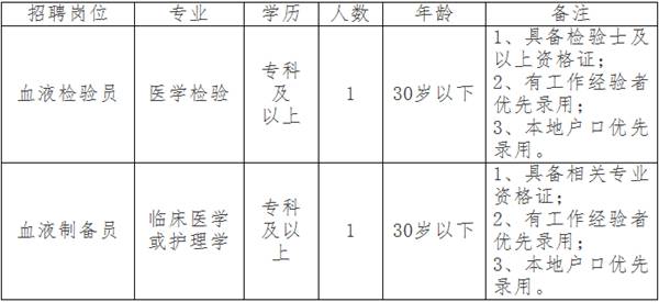 根據(jù)國(guó)家衛(wèi)計(jì)委及云南省衛(wèi)計(jì)委2016年的發(fā)展規(guī)劃,我州將開(kāi)展核酸檢測(cè)技術(shù),州中心血站目前的專業(yè)技術(shù)人員數(shù)量遠(yuǎn)遠(yuǎn)不能滿足采供血工作正常運(yùn)行的需要。根據(jù)血站的建設(shè)與發(fā)展的實(shí)際需要,經(jīng)研究決定面向全州公開(kāi)招聘編外合同制專業(yè)技術(shù)人員2名,現(xiàn)將有關(guān)事宜公告如下: