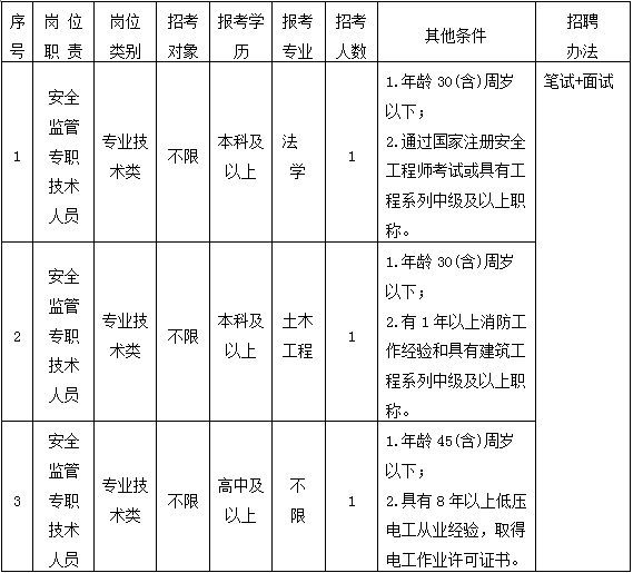 法律崗位安全生產(chǎn)監(jiān)管專職技術(shù)人員:筆試內(nèi)容為安全生產(chǎn)法律法規(guī)、職業(yè)病防治法律法規(guī)和行政執(zhí)法及執(zhí)法文書、卷宗等有關(guān)知識。