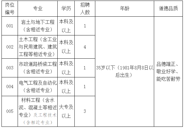 注:1、巖土與地下工程專業(yè)應聘人員如有國家注冊巖土工程師證書的年齡可以放寬至45歲,且待遇另行商定。