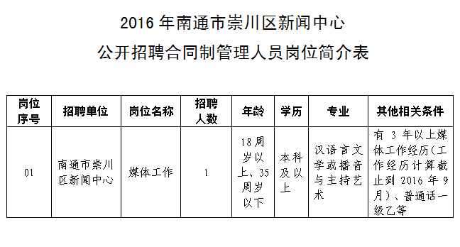 具體招聘崗位、人數(shù)等詳見《2016年南通市崇川區(qū)新聞中心公開招聘合同制管理人員崗位簡介表》(附件1)。