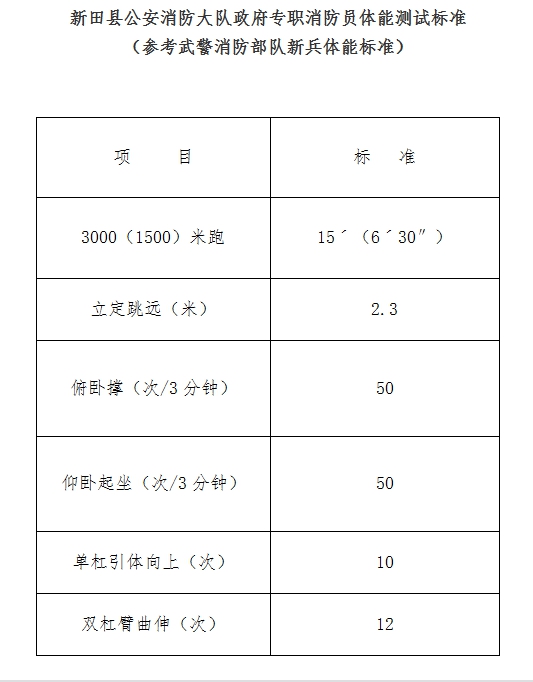 4、標(biāo)準(zhǔn):參考武警消防部隊(duì)新兵體能標(biāo)準(zhǔn)(附件2)。