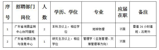 廣東省地震局是實行中國地震局和廣東省人民政府雙重領(lǐng)導,以中國地震局領(lǐng)導為主的事業(yè)單位,擔負著廣東省地震監(jiān)測預報、震災防御、應急救援等工作任務。為加強廣東省地震局專業(yè)技術(shù)隊伍建設,進一步增強服務廣東經(jīng)濟社會發(fā)展的能力,現(xiàn)面向社會公開招聘3名工作人員,有關(guān)事項公告如下: