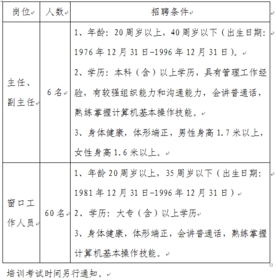 對符合條件的報名人員進行5天業(yè)務(wù)和基本技能培訓(xùn)(無償培訓(xùn)),培訓(xùn)后筆試考試,按高分到低分取前76名參加下一輪精準培訓(xùn),培訓(xùn)時間為20天(每天予以補助),培訓(xùn)后考試,按筆試成績占60%、上機操作成績占40%的比例折算綜合成績,采用百分制計算總成績,精確到小數(shù)點后兩位。綜合成績相同的,按筆試成績排名,從高分到低分取前66名參加體檢。體檢不合格的予以淘汰,按綜合成績從高分到低分依次替補。培訓(xùn)、考試的時間另行通知。
