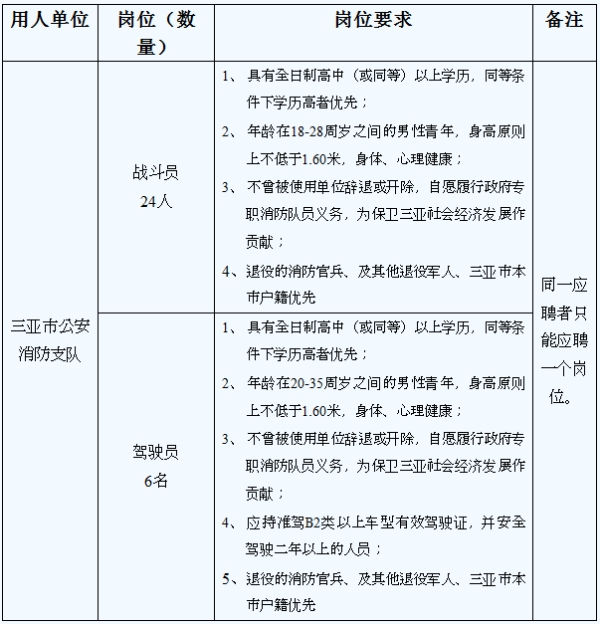 根據(jù)我支隊用人需求和相關(guān)法律政策規(guī)定,現(xiàn)面向社會公開招聘30名專職消防隊員。歡迎符合條件人士積極投身于消防事業(yè)工作,為國家和部隊建設(shè)貢獻力量。