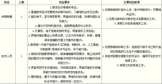 因工作需要,我校泉州數(shù)字研究院擬公開招聘委托型項目制科研助理及技術(shù)人員各1名,工作地點(diǎn)為泉州,現(xiàn)將有關(guān)事宜通告如下: