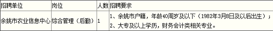 根據(jù)工作需要,余姚市農(nóng)業(yè)農(nóng)村局下屬事業(yè)單位面向社會公開招聘編外工作人員1名,F(xiàn)將有關(guān)招聘事項公告如下: