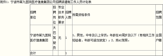 寧波市第九醫(yī)院醫(yī)療健康集團(tuán)因發(fā)展需要,根據(jù)有關(guān)規(guī)定,擬向社會(huì)公開(kāi)招聘派遣制工作人員1名,F(xiàn)就有關(guān)事項(xiàng)公告如下: