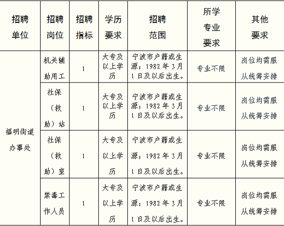 因工作需要,寧波市鄞州區(qū)福明街道擬面向社會(huì)招聘編外工作人員4名。具體要求如下: