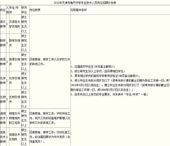 (三)各崗位具體報(bào)考條件見(jiàn)附件一《2022年天津市南開(kāi)中學(xué)專業(yè)技術(shù)人員崗位招聘計(jì)劃表》。