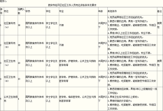 招聘崗位為社區(qū)服務(wù)崗A、B崗;社區(qū)衛(wèi)生崗A、B崗;公共衛(wèi)生防疫崗等5個(gè)崗位。具體崗位信息詳見(jiàn)《西安市經(jīng)開(kāi)區(qū)社區(qū)工作人員崗位資格條件及要求》。