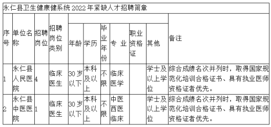 2022年,永仁縣衛(wèi)健系統(tǒng)招聘緊缺專業(yè)技術人才5名,其中:永仁縣人民醫(yī)院臨床醫(yī)學專業(yè)4名、永仁縣中醫(yī)醫(yī)院中西醫(yī)臨床專業(yè)1名。