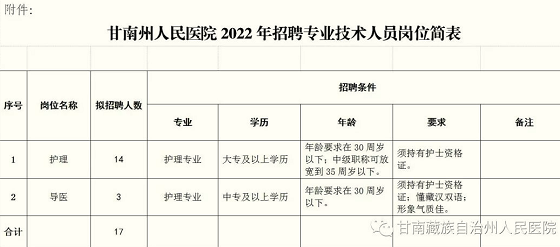 本次招聘專業(yè)技術(shù)人員計劃共17名,其中:護理人員14名,導醫(yī)3名,詳見《甘南州人民醫(yī)院2022年度招聘專業(yè)技術(shù)人員崗位簡表》。