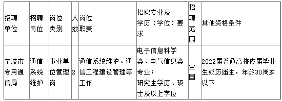 根據(jù)《寧波市事業(yè)單位公開招聘工作人員實施辦法》和《關(guān)于進(jìn)一步貫徹落實〈寧波市事業(yè)單位公開招聘工作人員實施辦法〉的意見》的有關(guān)規(guī)定,經(jīng)中共寧波市委組織部同意,中共寧波市委辦公廳所屬事業(yè)單位寧波市專用通信局決定面向全國公開招聘事業(yè)編制工作人員2名,F(xiàn)就有關(guān)事項公告如下: