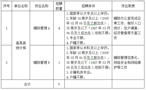 根據(jù)工作需要,經(jīng)縣政府研究同意,高邑縣人力資源和社會保障局委托第三方人力資源公司,為高邑縣統(tǒng)計局公開招聘工作人員5名,有關(guān)事項(xiàng)如下: